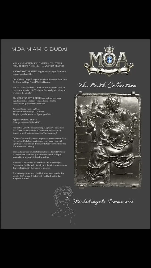 The 16 Billion USD Precious Metal Michelangelo Buonarroti Collection which has been from the original Plasters cast which the 1000 Years old Agnone Italian Marinelli Foundry from the original Vatican Sculptures - under the supervision and authorization of the Vatican over 100 Years ago realized